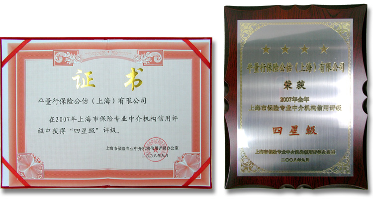 二零零八年九月,上海巿保险专业中介机构信用评级办公室向本公司颁发了“四星级”信用等级荣誉证书。该荣誉表明平量行保险公估(上海)有限公司在业务质量、诚信履约等方面得到了业界以及政府的一致认可。我公司获此殊荣是全体员工共同努力的结果。